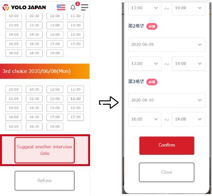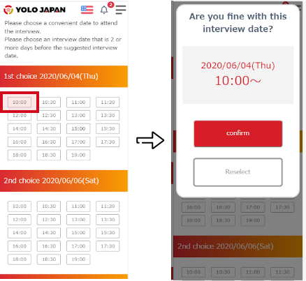 Details hereFor the interview, please select your desired date and time provided by the company.After an interview has been confirmed, you can check the interview schedule and details here.
