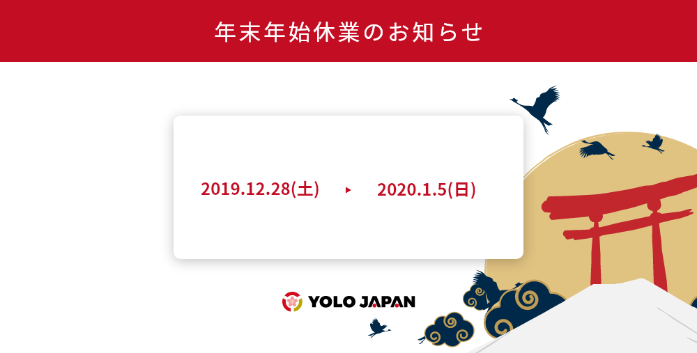 平素より株式会社YOLO JAPANをご愛顧いただき誠にありがとうございます。誠に勝手ながら、12月28日(土)より1月5日(日)まで、YOLO JAPANオフィスは年末年始休業とさせて頂きます。 大変ご迷惑をおかけいたしますが、何卒ご理解の程よろしくお願い申し上げます。 休業日:2019年12月28日(土) ~ 2020年1月5日(日)※上記期間中は電話受付及びメールサポートも休止致します。 休業期間中にいただきましたお問い合わせに関しましては、2020年1月6日(月)以降に担当者より順次回答せていただきますのでご了承ください。