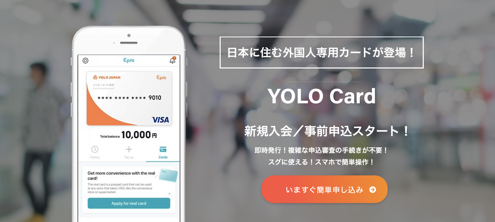 YOLO Cardは日本に住む外国人がYOLO JAPANが運営する会員サイト「YOLO JAPAN」(サイトURL:https://www.yolo-japan.com/ja/)に登録し、申し込むだけで発行できるチャージ機能付きプリペイドカードです。カード番号がアプリ内ですぐに発行され、全国のVisa加盟店でご利用いただけます。