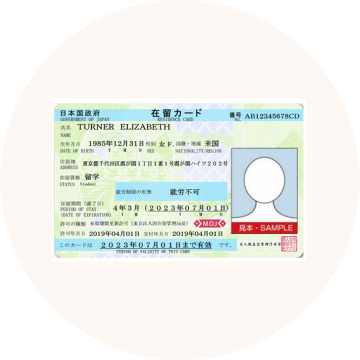 이름 등의 기본적인 신분 사항이나 재류 자격 · 재류 기간이 기재되어 있고 얼굴 사진도 부착되어 있습니다.