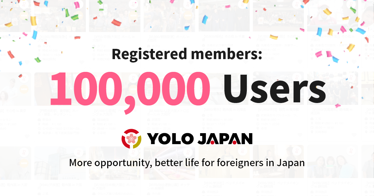 언제나 YOLO JAPAN을 이용해 주셔서 감사합니다. YOLO JAPAN의 회원수가 10 만명을 돌파했습니다! 앞으로도「더 많은 기회, 더 나은 삶을 일본 거주 외국인에게」 를 사명으로 사용자 여러분의 고민을 밀접하게 서포트하기 위해, 앞으로도 다양한 분야에서 서비스를 전개해 나갈 것입니다.