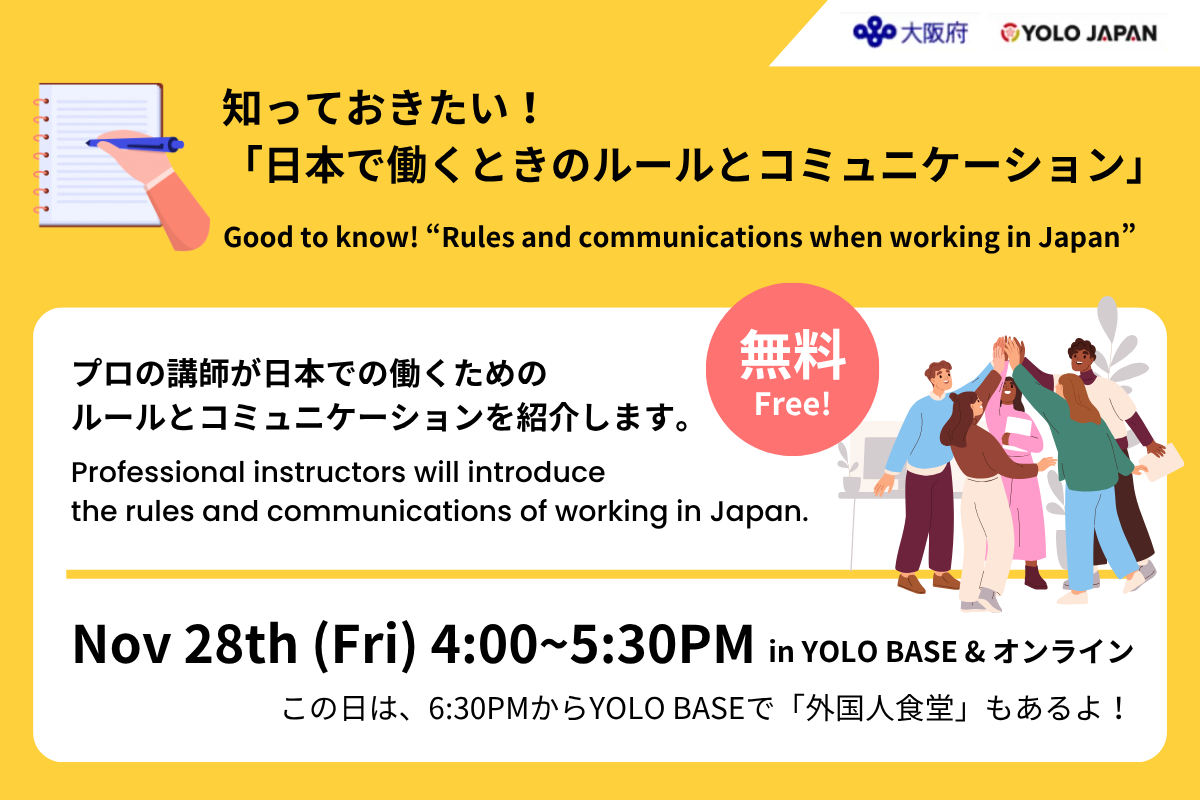 A job seminar for non-Japanese residents will be held at YOLO BASE on Friday, November 28, 2025.